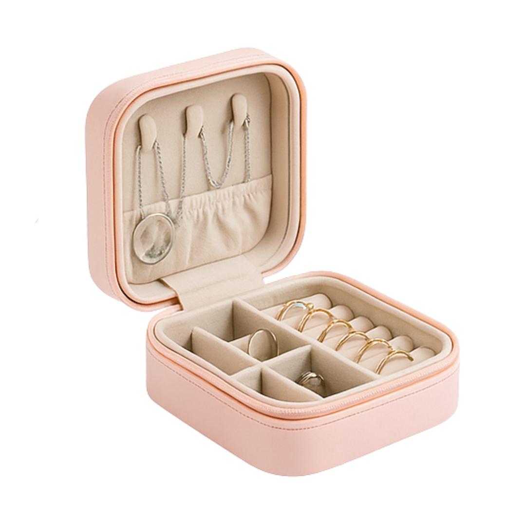 - Es un estuche compacto y portátil, diseñado para organizar y proteger joyas.