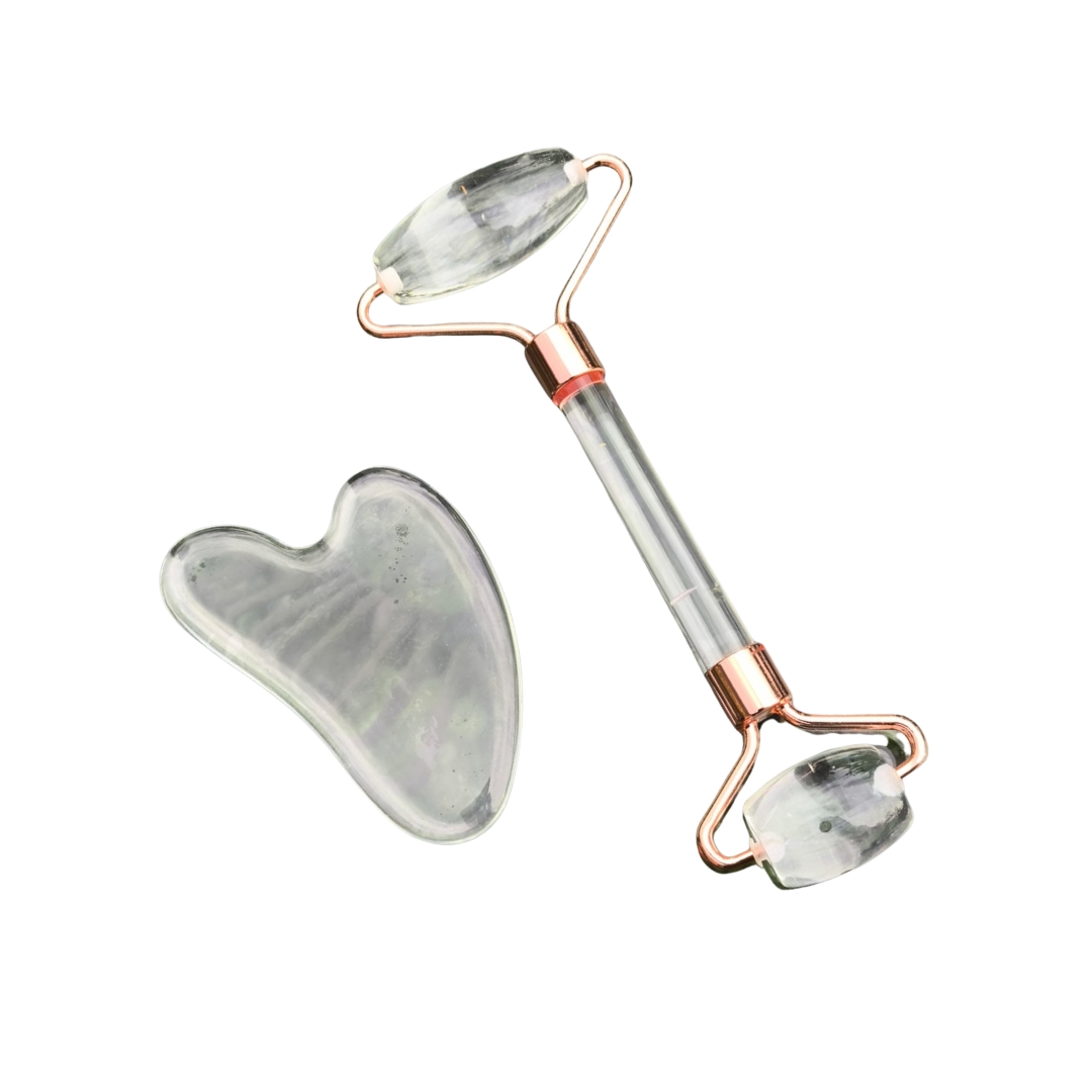 Set de Rodillo Facial y Piedra Guasha de Cuarzo. Color Transparente
